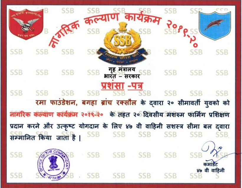 Rama Foundation (Rama Technical Institute) has been awarded a Certificate of Appreciation by the Sashastra Seema Bal (SSB) of the Government of India for successfully conducting a 20-day skill training program for the youth of border areas under the Civic Action Program, recognizing its outstanding contribution to skill development and community welfare.
